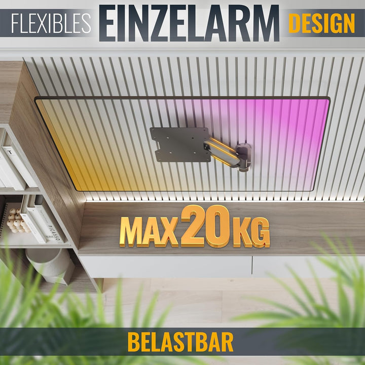 - 𝗙𝗨𝗡𝗞𝗧𝗜𝗢𝗡𝗘𝗡: Diese Bildschirm Halterung ist 180 Grad schwenkbar bei max Bildschirmbreite 60cm. Monitor Arm Neigebereich +/-15 Grad. Wandabstand des Wandhalter flexibel 55-360mm. Frontplatte drehbar +/-2 Grad