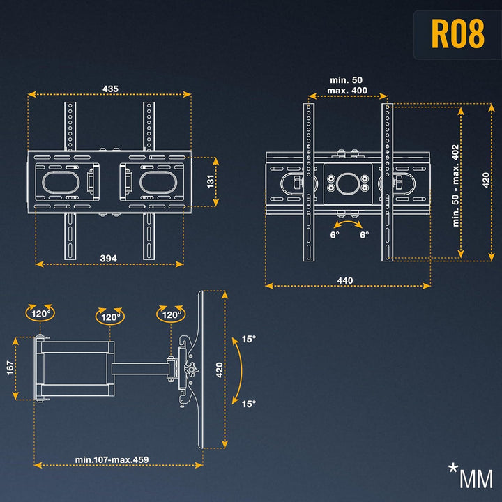 - 𝗙𝗨𝗡𝗞𝗧𝗜𝗢𝗡𝗘𝗡: Diese Fernseherhalterung ist bis 120 Grad schwenkbar wenn Bildschirmbreite max 64cm. Der Neigebereich liegt bei +/-15 Grad. Wandabstand zwischen 107mm - 459mm. Zur optimalen Einstellung nach der Montage ist die