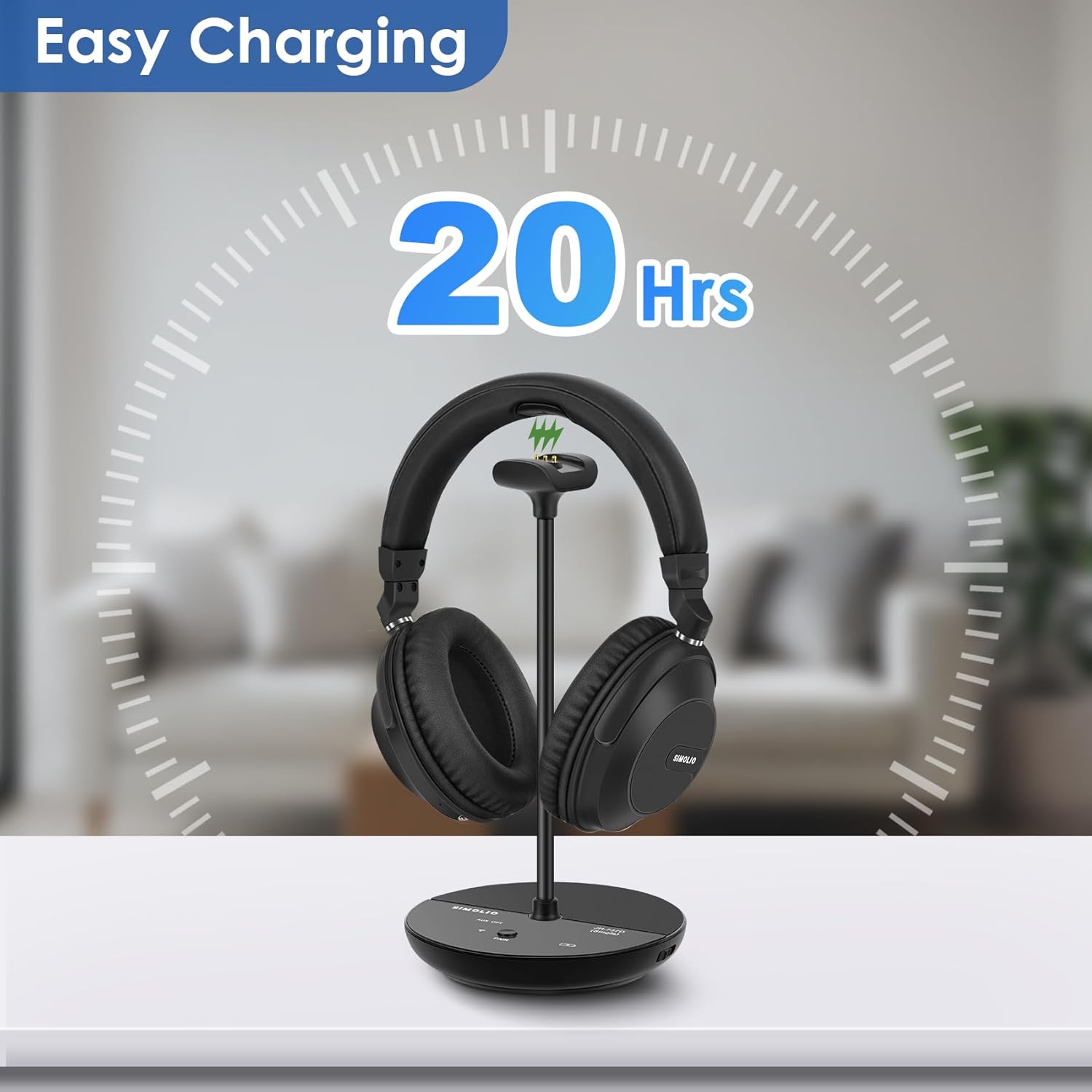 - [Komfortabler Sitz, bequemes Aufladen, lange Spielzeit] Der kabellose Sender für den Fernseher ist nicht nur ein doppelter Kopfhörerhalter, sondern dient auch als Ladestation. Sie haben die Möglichkeit, ihn auch per Kabel aufzuladen. Mit einer vollen