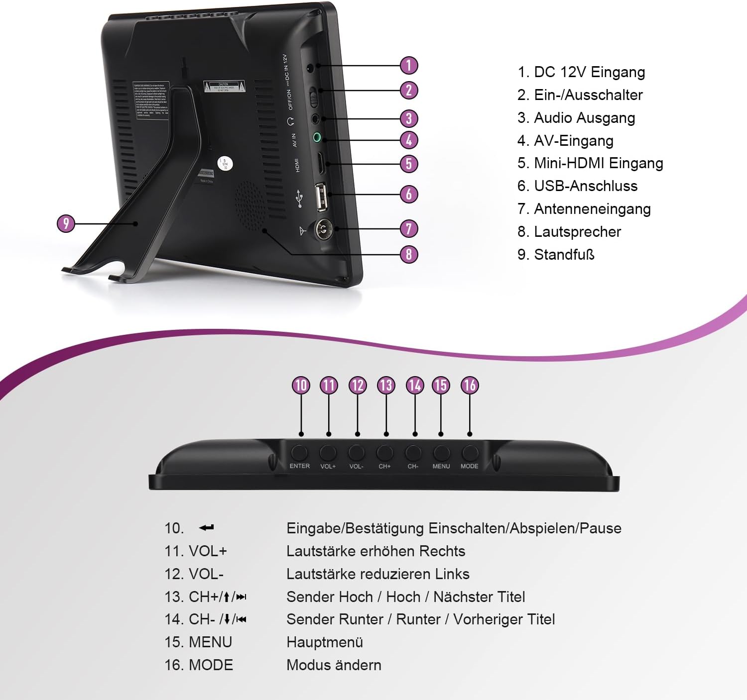 - Tragbarer 9“ Zoll (22,9cm) DVB-T2 Fernseher - Geniessen Sie alle öffentlich rechtlichen und frei empfangbaren HD Sender im 16:9 Format und in bester Bildqualität. Völlig kostenlos und in fast ganz Deutschland. Sie benötigen kein Internet-Datentarif