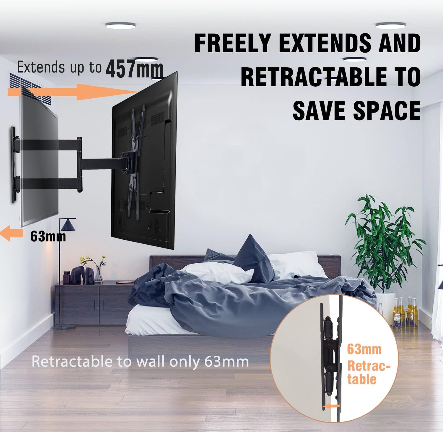 - Spart wertvollen Platz - Unsere Schwenkbare TV Halterung lässt sich in der Ausgangsposition bis zu 63 mm zu der Wand zurückziehen, um Platz zu sparen, und lässt sich ebenfalls maximal 457mm von der Wand ausfahren. Dadurch sparen Sie wertvollen Platz