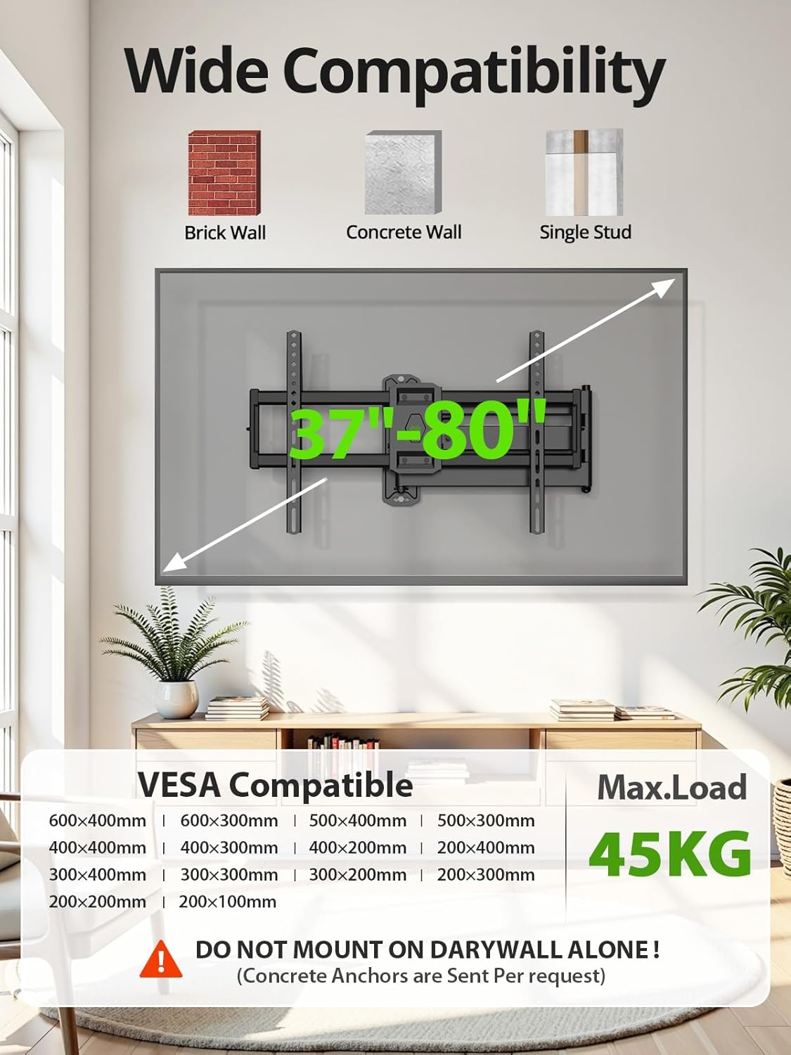 - Breite Kompatibilität: Der USX-MOUNT ultra-lange Fernsehwandhalter passt zu Fernsehern mit einer Grösse von 37–80 Zoll und ist mit VESA-Lochabständen von 200x100mm bis 600x400mm kompatibel. Die Ausfahrweite beträgt 64mm bis 814mm. Das Produkt kann
