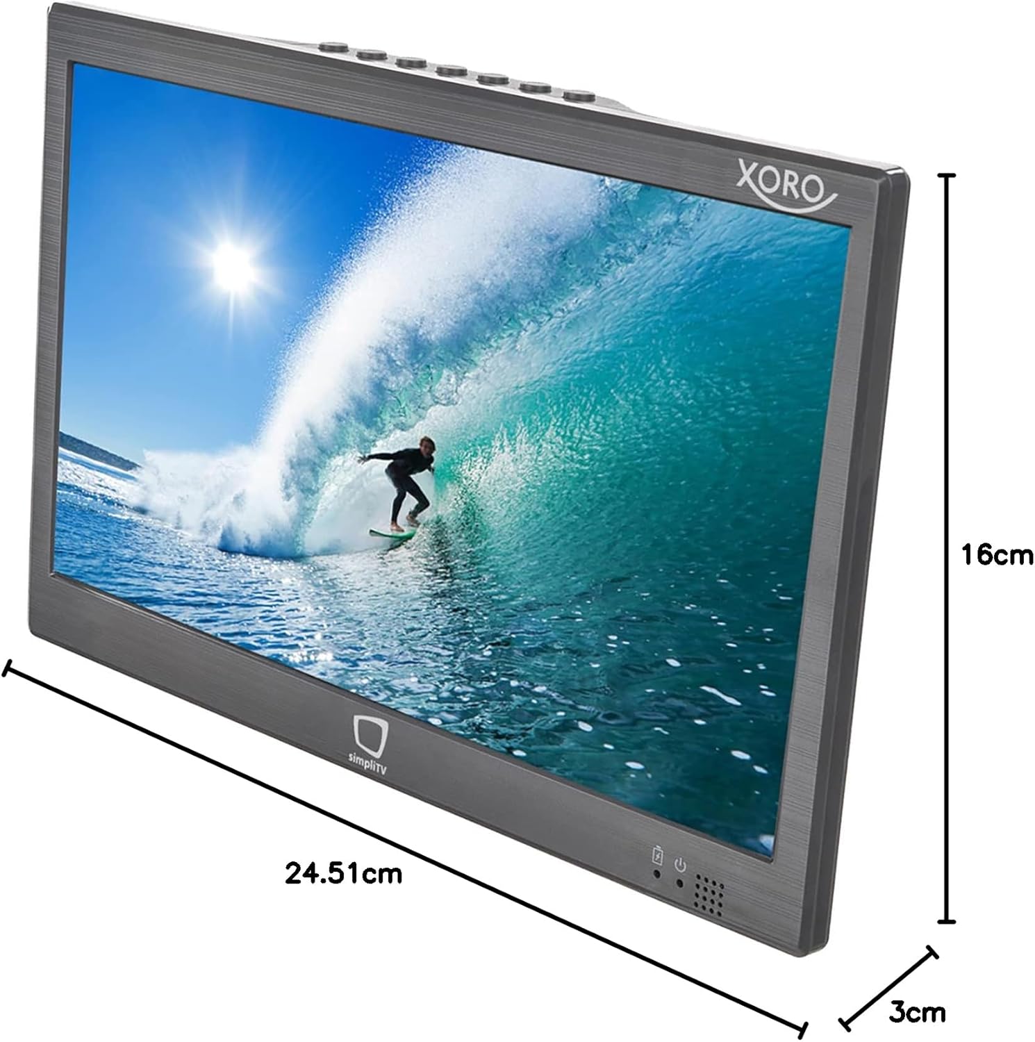 - [ZUBEHÖR/ LIEFERUMFANG] Xoro PTL 1055 mit integriertem simplyTV Modul für DVB-T2 in Österreich, Fernbedienung, Bedienungsanleitung, KFZ Adapter, Teleskopantenne mit Magnetfuss, Netzteil, 3,5 Klinke zu Cinch Kabel.