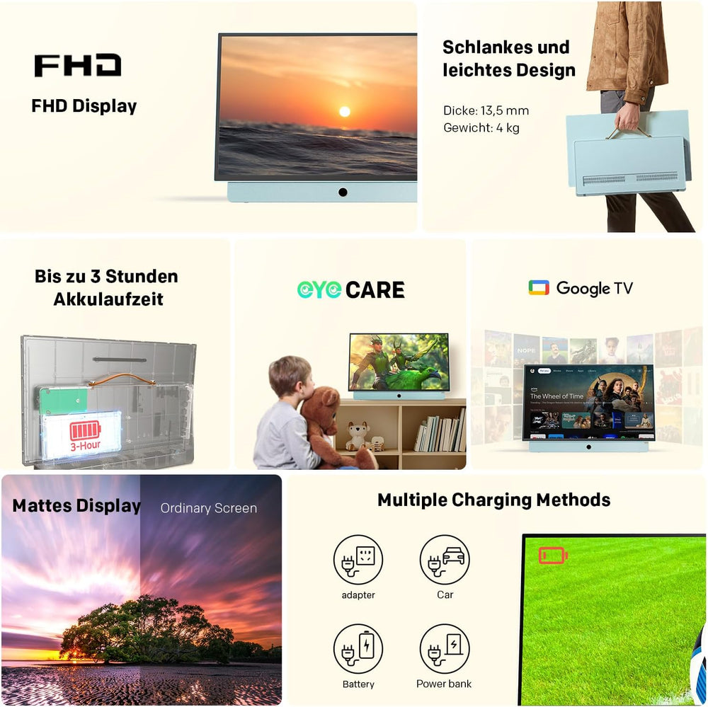 SYLVOX Tragbarer Fernseher 15,6 Zoll | Google TV, 10000 mAh Akku (6h Laufzeit) | IP66 Wasserdicht |