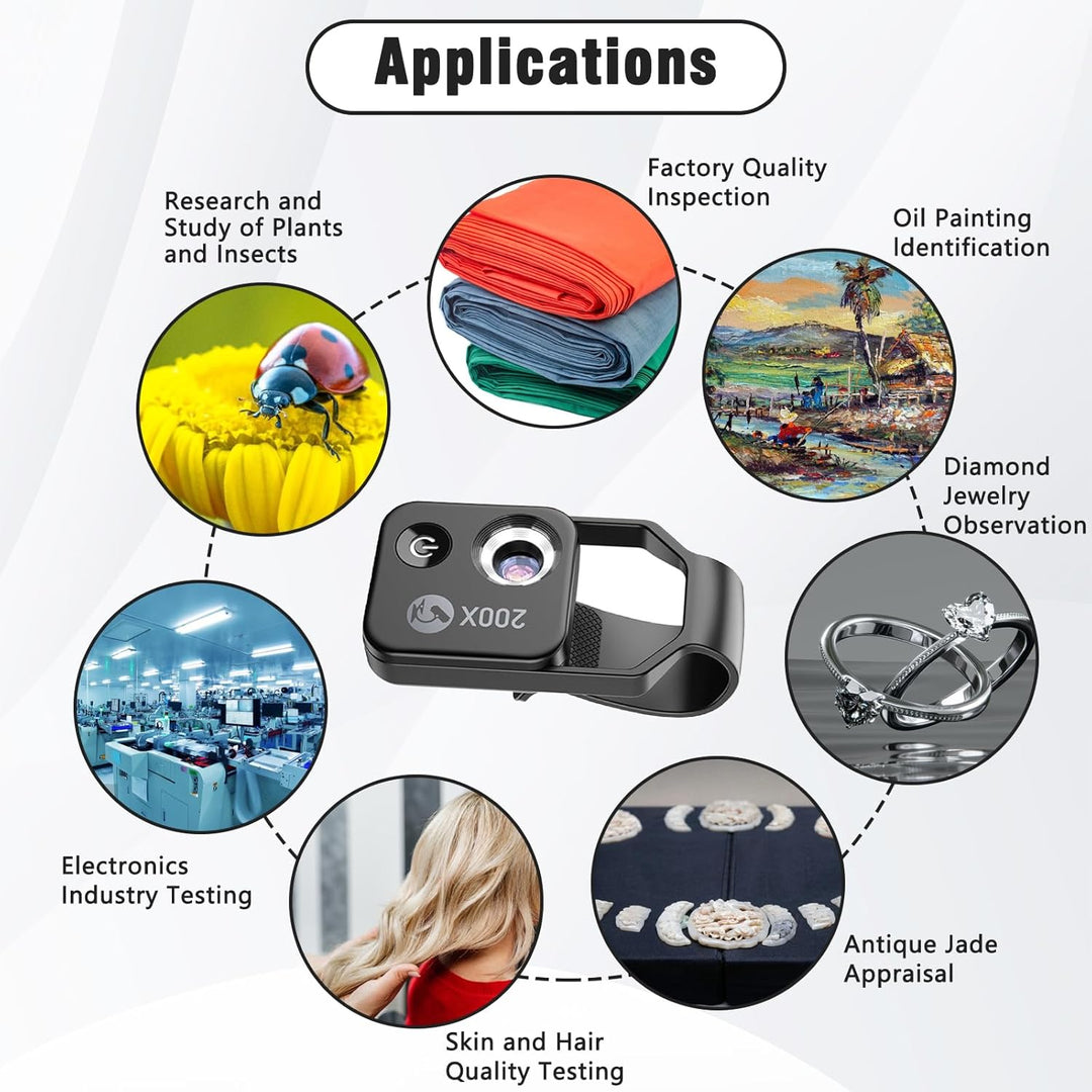 - 200-Fache Hochauflösende Vergrösserung: Handy mikroskop verwendet ein optisches system, das eine bis zu 200-fache klare vergrösserung erreichen kann. Egal, ob sie tief in die geheimnisse der mikroskopischen welt eintauchen oder präzisionsdrucke