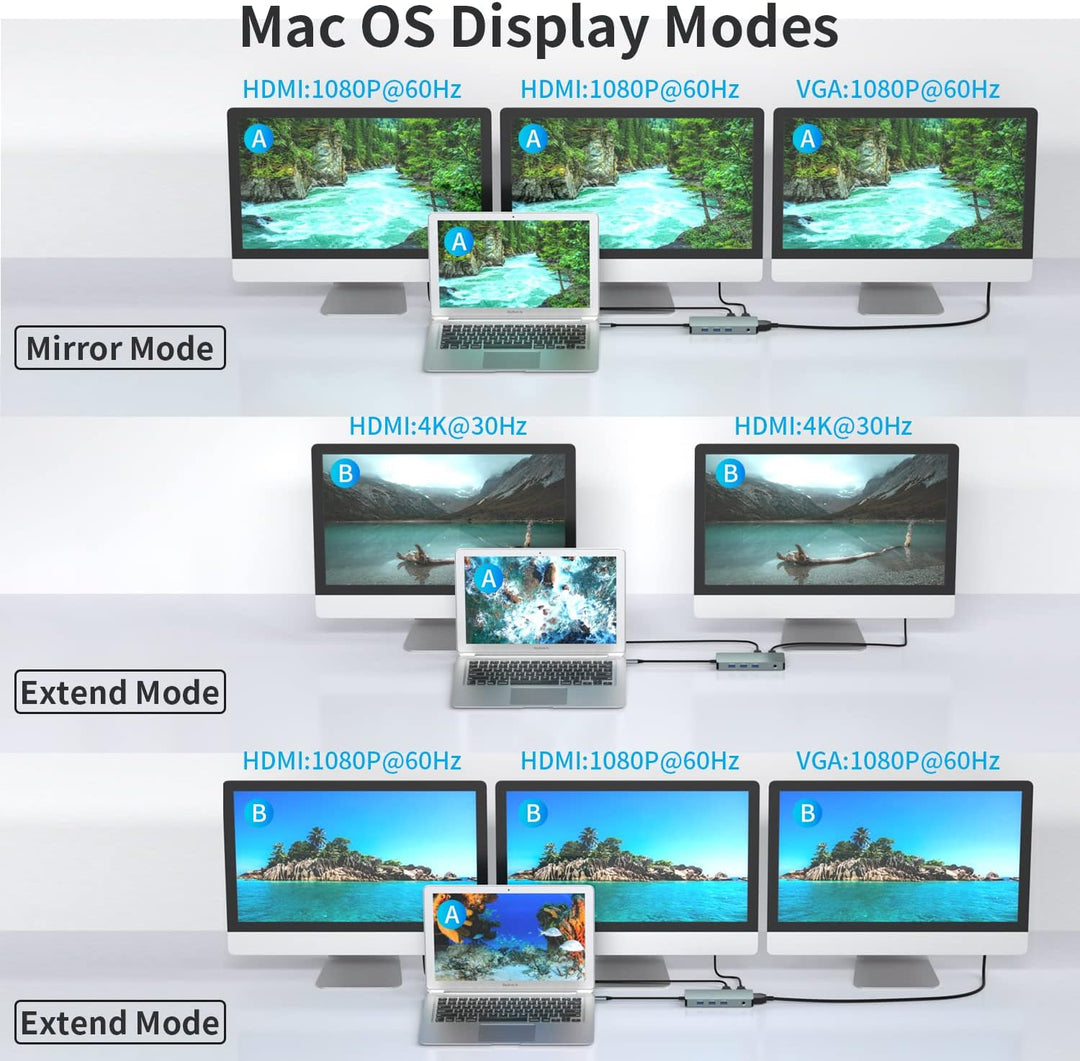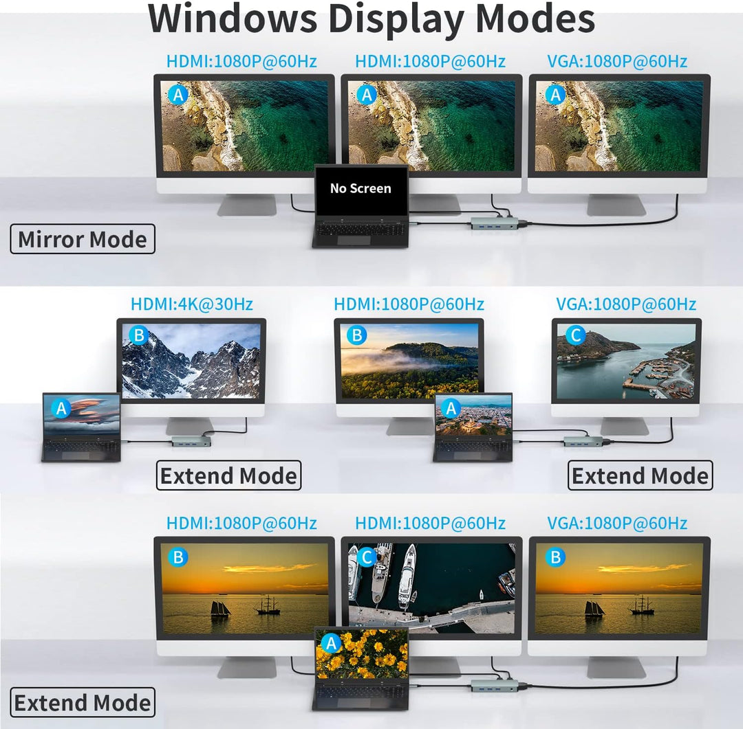 - 【WINDOWS-Dreifachanzeige】Dreifachanzeige: HDMI+HDMI+VGA, aber nur das Windows-System unterstützt die Dreifachanzeige; Mac OS wird nicht unterstützt. Spiegeln oder erweitern Sie Ihren Bildschirm mit einem USB-C-Adapter-Monitor. Streamen Sie 4K Ultra