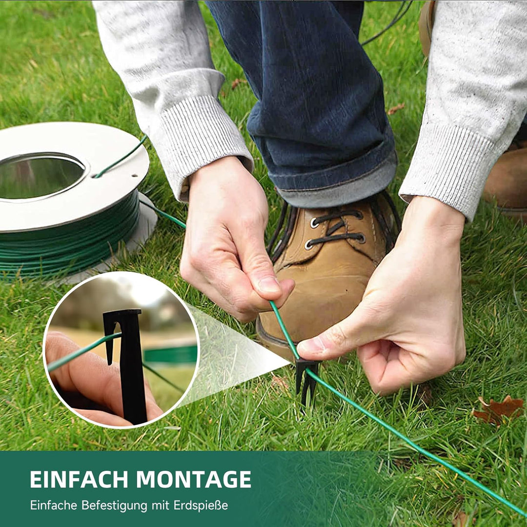 • [Einfache Installation]: Mit unserer Kunststoffspule verlegen Sie den Begrenzungsdraht mühelos in Ihrem Garten. Die grüne Farbe fügt sich nahtlos in Ihre Rasenfläche ein, während die Ummantelung vor Witterungseinflüssen schützt. Nutzen Sie es