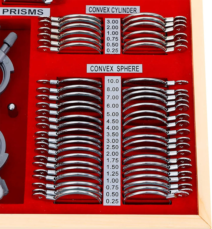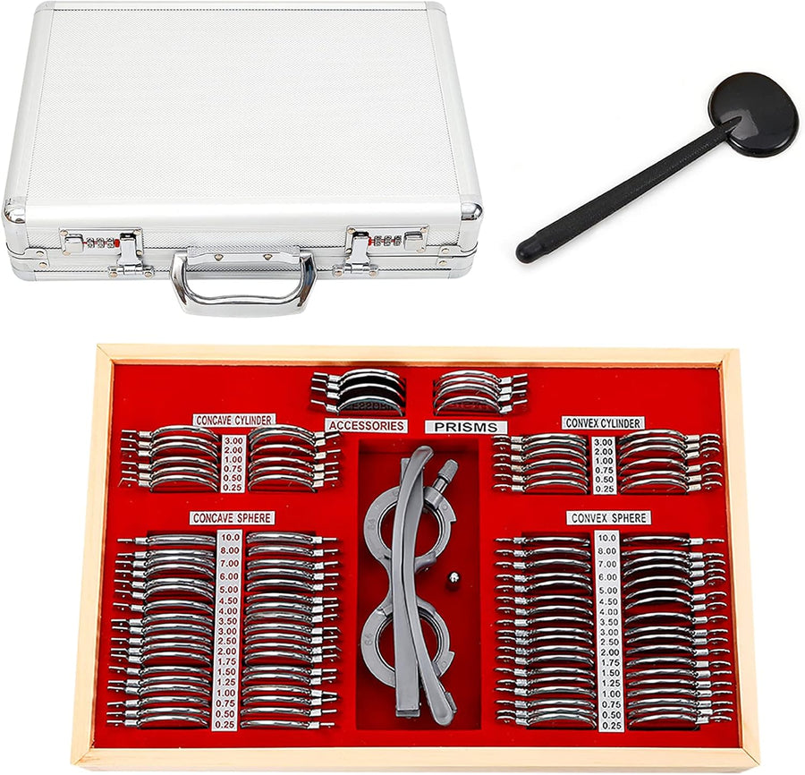 PRODUKTBESCHREIBUNGEN 104tlg Optisches Testlinsen-Set Optometrie-Kit Metallrand Testrahmen Werkzeugset Beschreibung Material: Glas + Metall Farbe: Silberfarbene Box Grösse: 38x27x6cm Eigenschaften: Werkzeuge sind komplett Genauigkeitsgrad Konzentrieren Sie sich auf jedes Detail Wissenschaft und Technik sorgen für Ihre Gesundheit. Testlinsen-Set: mit 104 Linsen im Inneren, darunter 72 Kugellinsen, 24 Zylinderlinsen, 4 Prismen, 4 Zubehörlinsen, 1 Proberahmen und anderes optometrisches Zubehör.
