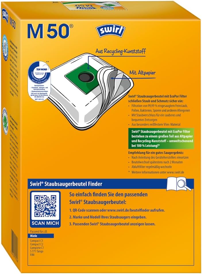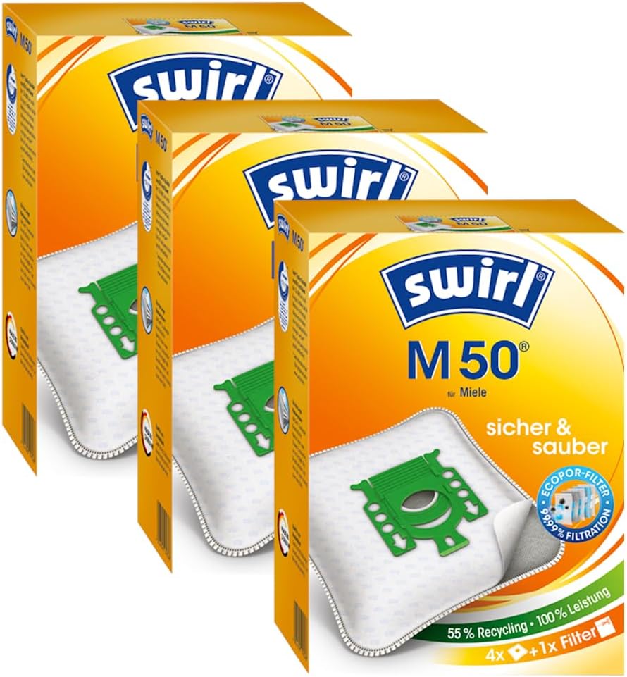 PRODUKTBESCHREIBUNGEN Swirl AirSpace Typ M50 Swirl Staubfilterbeutel MicroPor PLUS AirSpace ·MicroPor PLUS Filtration mit Anti-Allergen Filterschicht für ein sauberes, staubfreies und allergikerfreundliches Reinigungsergeb-nis ·Höchste Saugkraft bis zum vollen Beutel dank AirSpace Long Power-Garantie ·DIRTLOCK Funktion für eine staubfreie Entsorgung des vollen Staubfilterbeutels Lieferumfang: 3 Packungen Swirl M50 (4 Beutel + 1x Filter) = 12x Hochwertige Staubsaugerbeutel + 3 Filter passend für: MIELE * Typ M * Miele S 500 --> S 558 * AMBIENTE PLUS * CAT & DOG PLUS * EXQUISIT M * GOLD 2000 * METEOR M * METEOR PLUS * MONDIA M * SALSA * SENATOR 1600 CL * SENATOR 1600 SL * SINA * SILVER MAGIC * THE SOLUTION 500 * VENEZIA Mehr