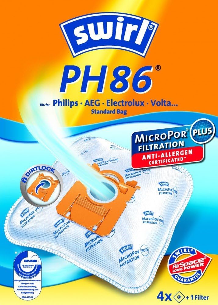 PRODUKTBESCHREIBUNGEN Swirl AirSpace Typ PH86 Swirl Staubfilterbeutel MicroPor PLUS AirSpace ·MicroPor PLUS Filtration mit Anti-Allergen Filterschicht für ein sauberes, staubfreies und allergikerfreundliches Reinigungsergeb-nis ·Höchste Saugkraft bis zum vollen Beutel dank AirSpace Long Power-Garantie ·DIRTLOCK Funktion für eine staubfreie Entsorgung des vollen Staubfilterbeutels Lieferumfang: 3 Packungen Swirl PH86 (4 Beutel + 1x Filter) = 12x Hochwertige Staubsaugerbeutel + 3 Filter passend für: ELECTROLUX-PHILIPS - Swirl PH86 AEG System Pro E200B Electrolux Clario Z1900-Z1995 Oxygen Z5000-Z5695 E200B E200 Excellio z5000-Z5295 Smartvac Z5000-Z5695 Hugin HN 7005 Volta Boldio 1500- 4595 E200B E200 Philips Specialist FC9100-FC9150 Universe FC9000-FC9050 Milano New York Paris Riio Tokio City-Line HR8368-HR8399 Impact HR8350-HR8367 Expression HR8300-HR8349 FC8021 Sydney Mobilo HR 8500-8599 Tornado Boldio 1500- 4595 E200B E200