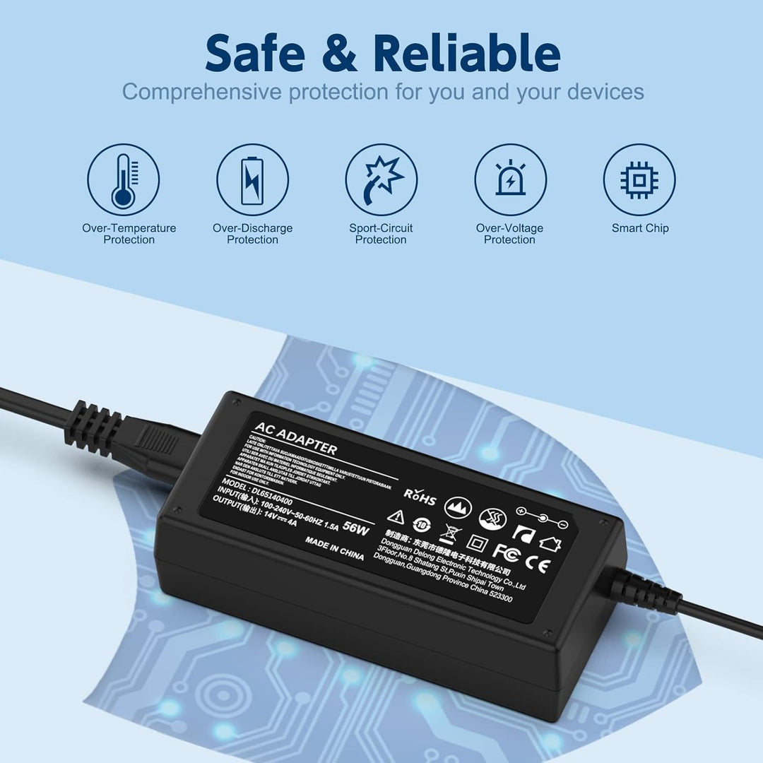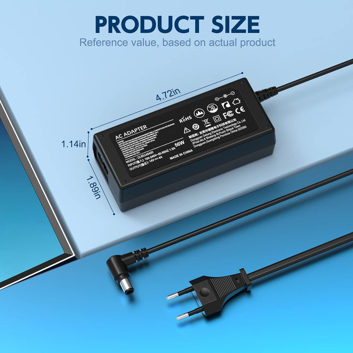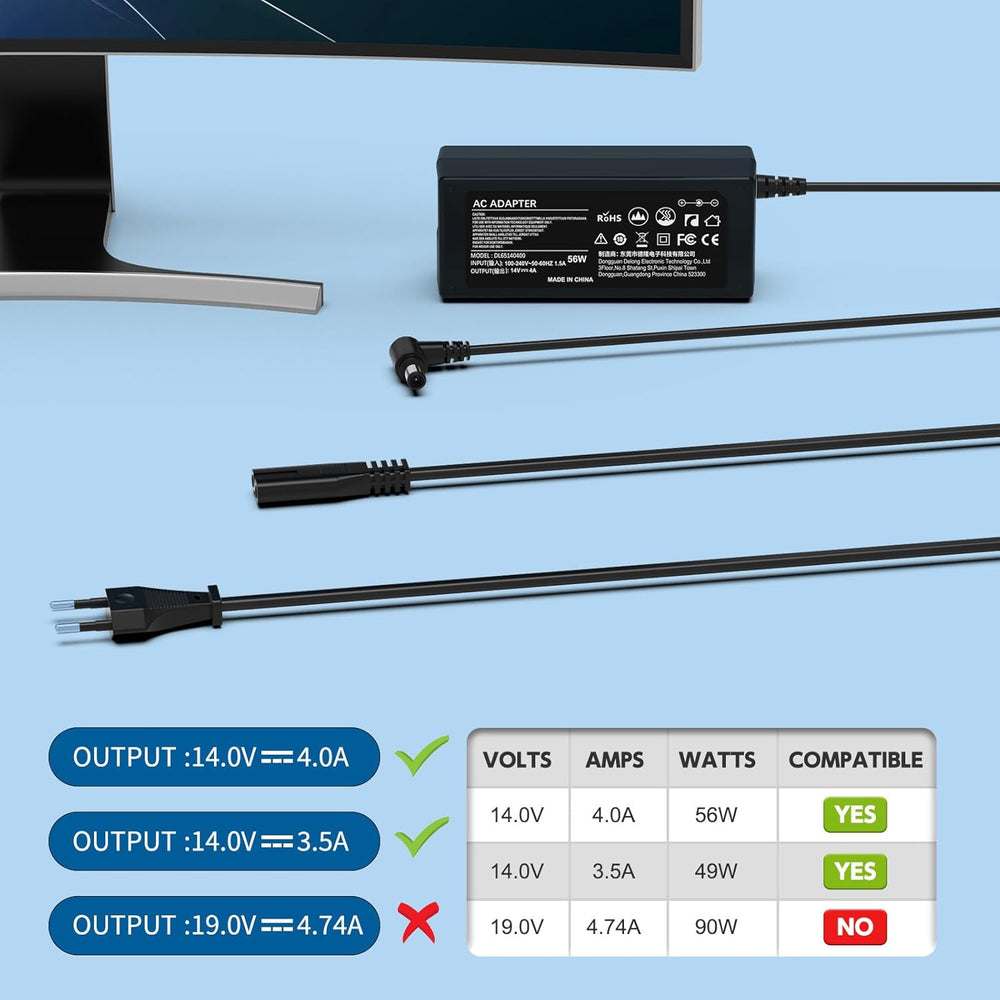- 【DC 14V Samsung Netzteil Monitor】Eingang: AC 100-240 V, 50-60 Hz, Ausgang: 14 V 4 A (Max); Kompatibel mit 3,5 A 3,3 A 3 A 2,14 A 1,79 A 1,78 A;Steckergrösse: 6,5 mm * 4,4 mm; Lieferumfang:1 x 14V Samsung Ersatz Ladegerät, 1 x Netzkabel.