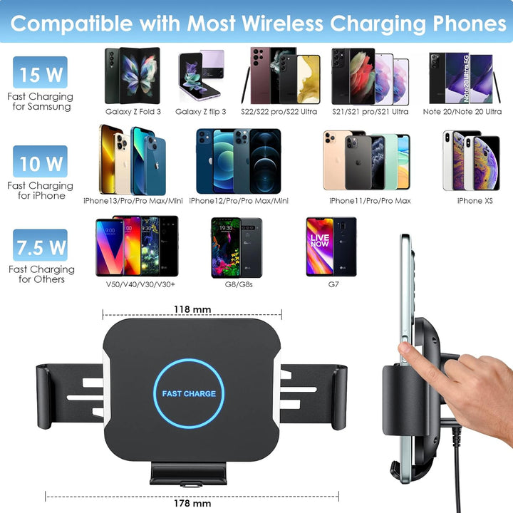 - Smart Auto Clamping - Drücken Sie die Entriegelungstaste der Halterung für das kabellose Mobilteil, und sie öffnet sich automatisch, klemmt Ihr Telefon und beginnt mit dem Aufladen. Dieses kabellose Qi-Ladegerät mit integriertem intelligenten Chip