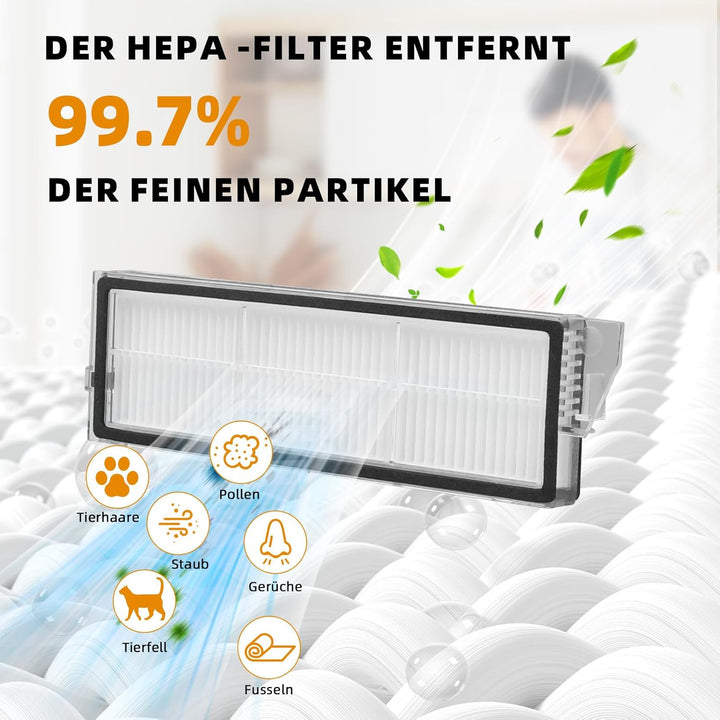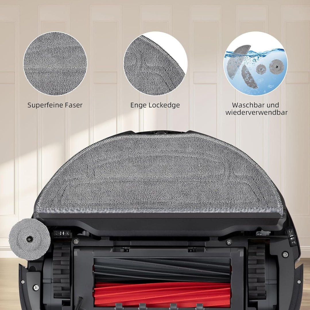 - 【Wischpad und Filter】Das Wischpad mit Zweizonen-Vibrationsmodul kann Schmutz und Flecken tiefer und effektiver entfernen. Der Kantenwischer kann Schmutz an den Ecken effektiv abwischen und mehr als 99,99% der Bakterien entfernen. Der HEPA-Filter