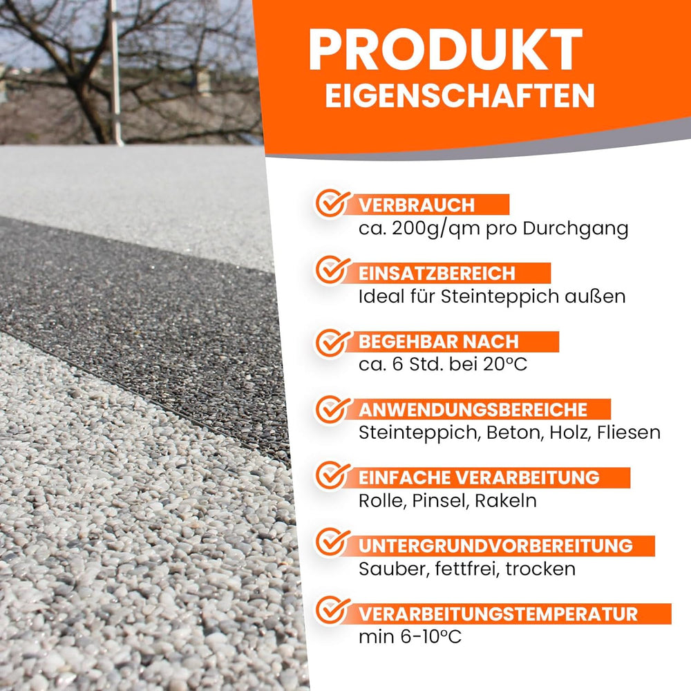 - 1K PU Versiegelung für Steinteppichböden innen und aussen - trocknet schnell, wird einfach gerollt oder gepinselt und bildet eine zähharte Beschichtung