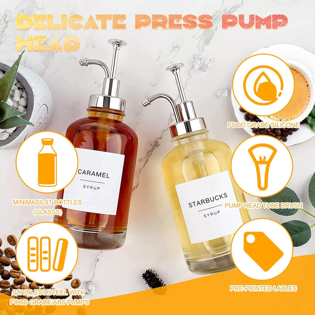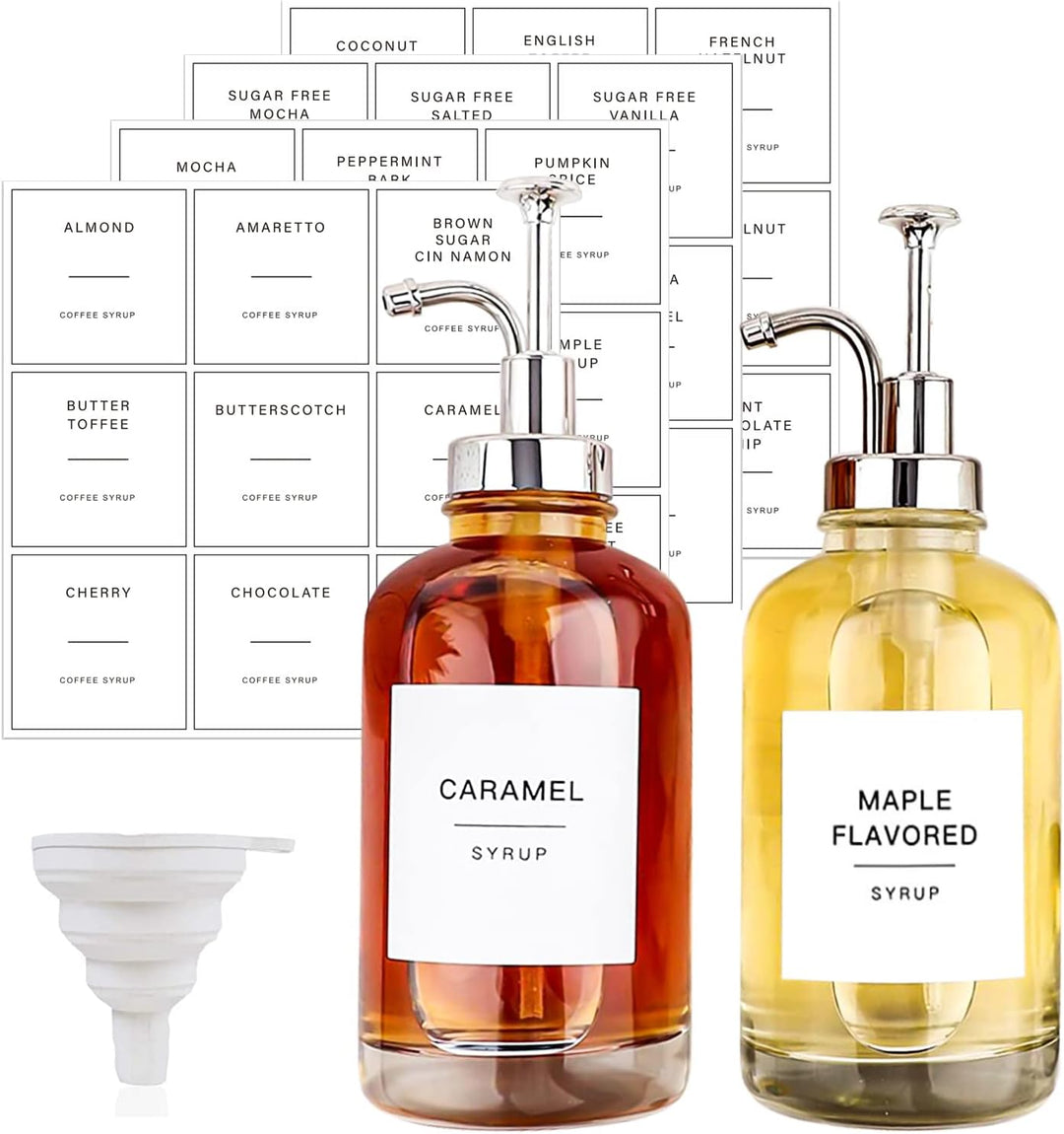 2 Stück Kaffee Sirup Spender Glas Set mit 36 Etiketten, Kaffee-Pumpenspender, Minimalistische Glas