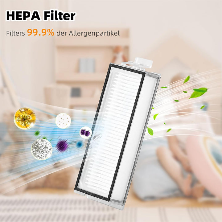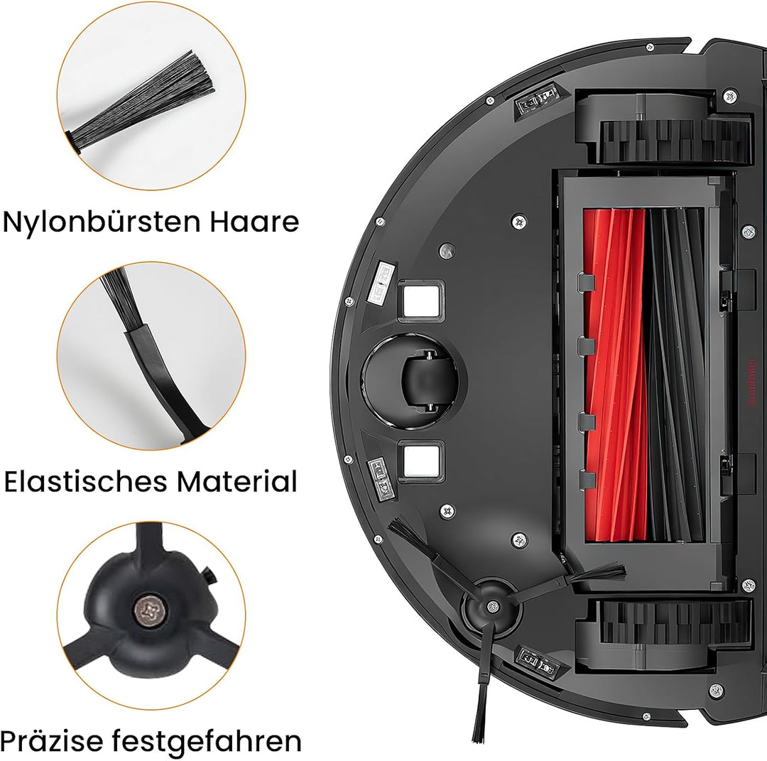 - 🎁【Was im Paket】abnehmbare Hauptbürste X2; Seitenbürsten X6; Wischtücher X6; HEPA filter X4, Reinigungsbürste X1, Schraubendreher X1. Tipps: Pflege alle 2-4 Wochen, 2-3 Monate empfohlener Ersatz.