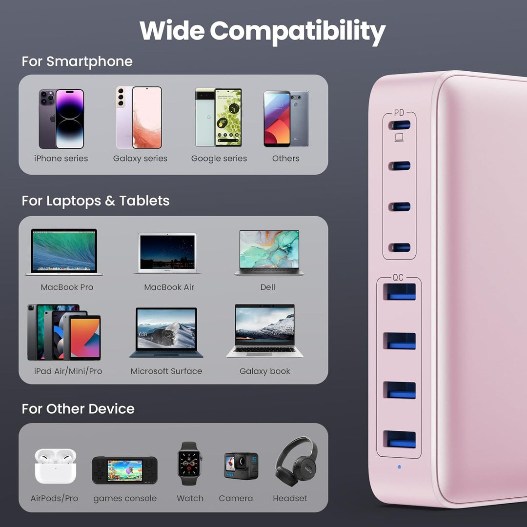 - 【8-in-1 USB C Ladegerät】Dieser USB Ladegerät bietet 8 Ladewattoptionen mit 4 USB-C-Anschlüssen und 4 USB-A-Anschlüssen. Ein solches USB-C-Multiport-Ladegerät kann alle Ihre Geräte mit hoher Geschwindigkeit verarbeiten. Das Coole ist, dass Sie