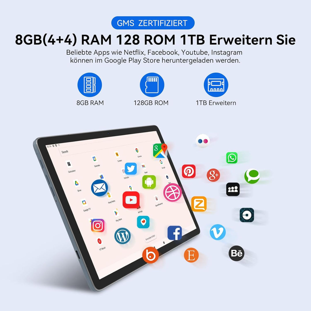 - 👍【8GB(4+4) RAM + 128GB ROM + 1TB Erweiterbar】 Das Tablet 10 Zoll verfügt über 8GB(4+4) RAM, 128GB ROM. Grosser Speicherplatz für Ihre tägliche Unterhaltung und Arbeit needs.Allowing Sie leicht übertragen Dateien auf einen PC.