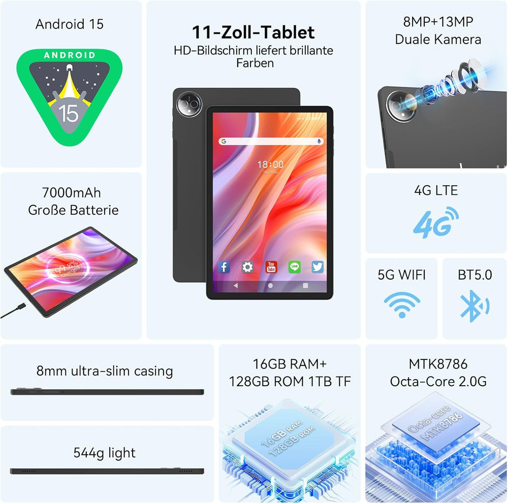 - [2025 Latest Android 14.0 OS, MTK8786 Octa-Core Processor]Das FEONAL 11-Zoll-Android-Tablet ist mit dem neuesten Android 14-Betriebssystem von 2025 (GMS-zertifiziert) ausgestattet, das einen schnellen MTK8786-Octa-Core-Prozessor und die neueste