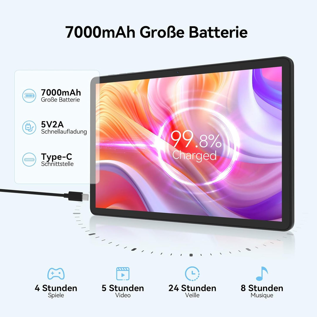 - [7000mAh Akku mit grosser Kapazität und Typ-C-Schnellladefunktion]Das Android-Tablet ist mit einem 7000-mAh-Akku mit hoher Kapazität und einer Standby-Zeit von bis zu 480 Stunden ausgestattet, sodass Sie es überallhin mitnehmen können, ohne sich
