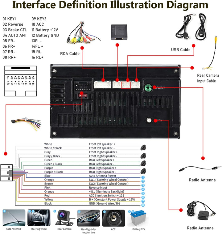 - 【Support Phone Mirror Link, Subwoofer und Verstärker】 Mit Video- und Audioausgang und -eingang, einem grünen Subwoofer-Anschluss, einem schwarzen Mikrofonanschluss und einer Leitung, die an AMP angeschlossen werden kann. Weitere Funktionen des Android-Steuergeräts: Helligkeitseinstellung; Hintergrundbildwechsel, geteilter Bildschirm, Phone Mirror Link, zwei USB-Kabel