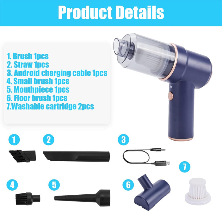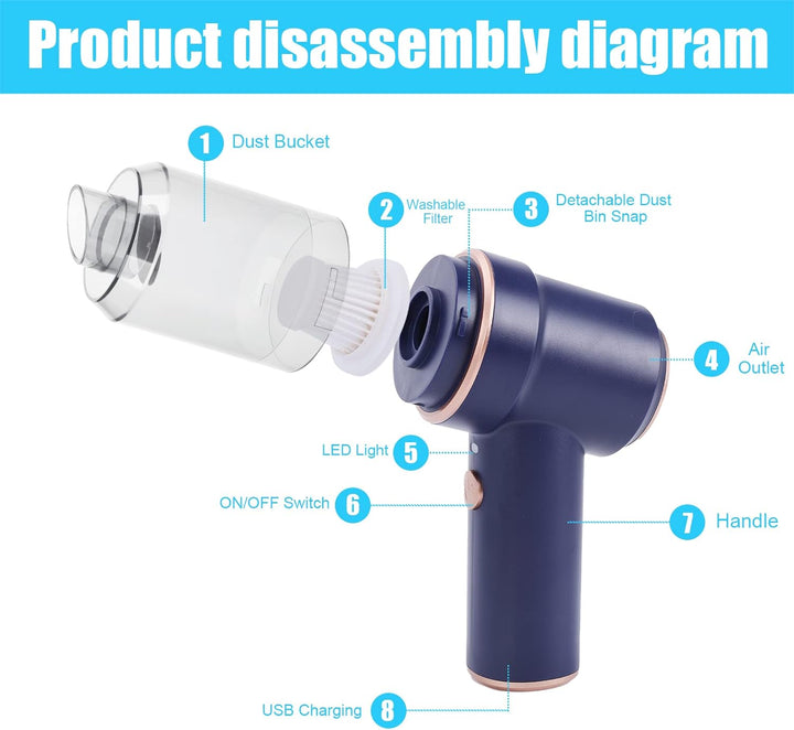 - [ Kabelloser und Wiederaufladbarer ]: ConBlom Mini Staubsauger mit eingebautem 4000-mAh-Akku, mit dem der elektrische handsauger eine halbe Stunde lang ununterbrochen arbeiten kann. Der Mini-Luftreiniger kann den Staub in jedem Winkel blasen, ohne dass