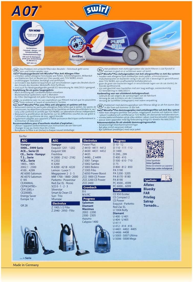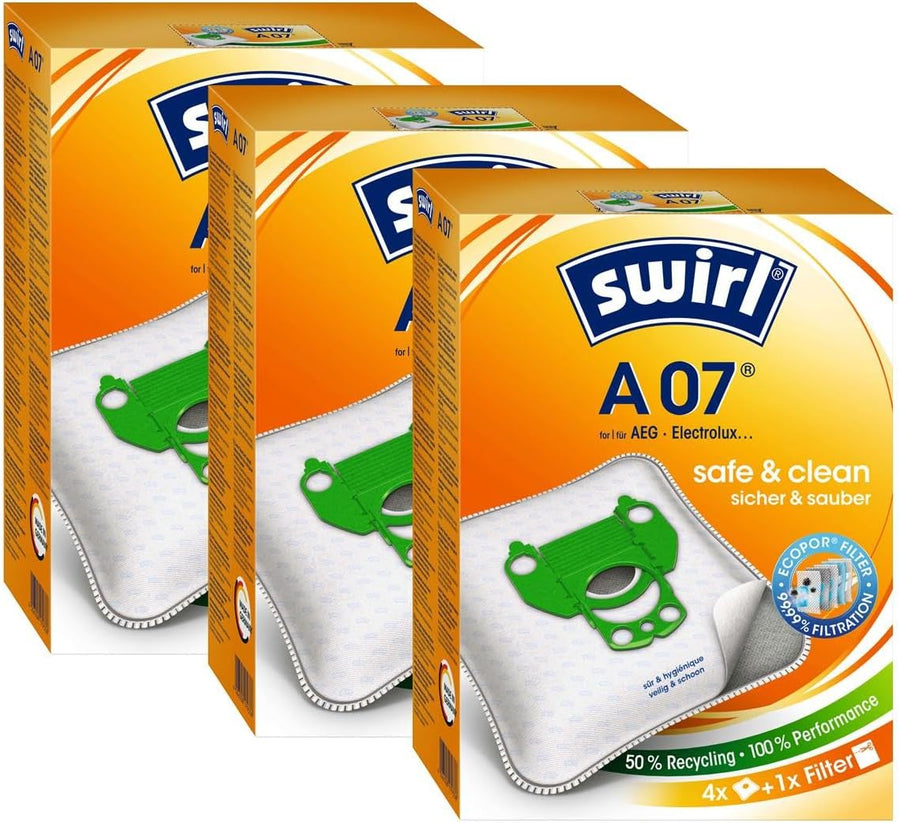 PRODUKTBESCHREIBUNGEN Swirl AirSpace Typ A07 Swirl Staubfilterbeutel MicroPor PLUS AirSpace ·MicroPor PLUS Filtration mit Anti-Allergen Filterschicht für ein sauberes, staubfreies und allergikerfreundliches Reinigungsergeb-nis ·Höchste Saugkraft bis zum vollen Beutel dank AirSpace Long Power-Garantie ·DIRTLOCK Funktion für eine staubfreie Entsorgung des vollen Staubfilterbeutels Lieferumfang: 3 Packungen Swirl A07 (4 Beutel + 1x Filter) = 12x Hochwertige Staubsaugerbeutel + 3 Filter passend für: AEG - Swirl MicroPor AirSpace A07 AEG / AEG-Electrolux * Gr. 28 * Serien: * Vampyr 5000 - 5999 * Vampyr CE 100 - CE 999 * Vampyr CE 2000 - 2999 * 5000 - 5999 * CE 100 - 999 * CE 2000 - 2999 * CE 1700 * CE 1700.1.. * CE 1800 Comfort * CE 5.1700 * CE 4100 - 4199 * CE Azzurro * CE Ultrapower * E 150 * E 160 * E 180 * E 181 * E 185 * E 190 * E 200 Turbo * E 1700 Plus * H 2000 * H 2162 * H 2182 * H 2202 * HH 2202 * K 3170 * K 3180 * K 3200 * MM 1700 * MM 1800 * MM 2000 * 1500 * 1600 * 1605 * 1610 * 1700E * 1803 * 1804 * 1805 * 1810 * 1900 * 1905 * 2002.1 * 2300 * 4110 * 4111 * 4120 * 5200 Privileg * 084.972 * 104.432 * 107.023 * 403.970 * 101.393 * 104.480 * 163.221 * 595.096 * 102.974 * 106.724 * 304.782 Satrap * aspira classic 1800 Volta * Serie Diamant * U 400 * U 404 * U 405 * U 412 * U 414