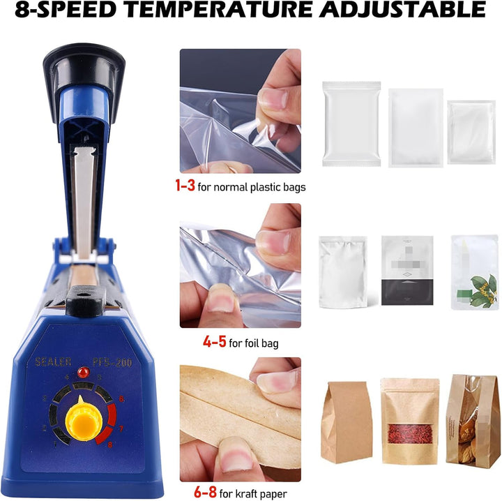 - 【Anpassbare Temperaturregelung】Die Folienschweissgerät verfügt über eine 8-stufige Temperaturregelung, sodass Sie Mylar-, PE- und PP-Beutel problemlos versiegeln können. Testen Sie vor jedem Gebrauch und wählen Sie die passende Temperatur für