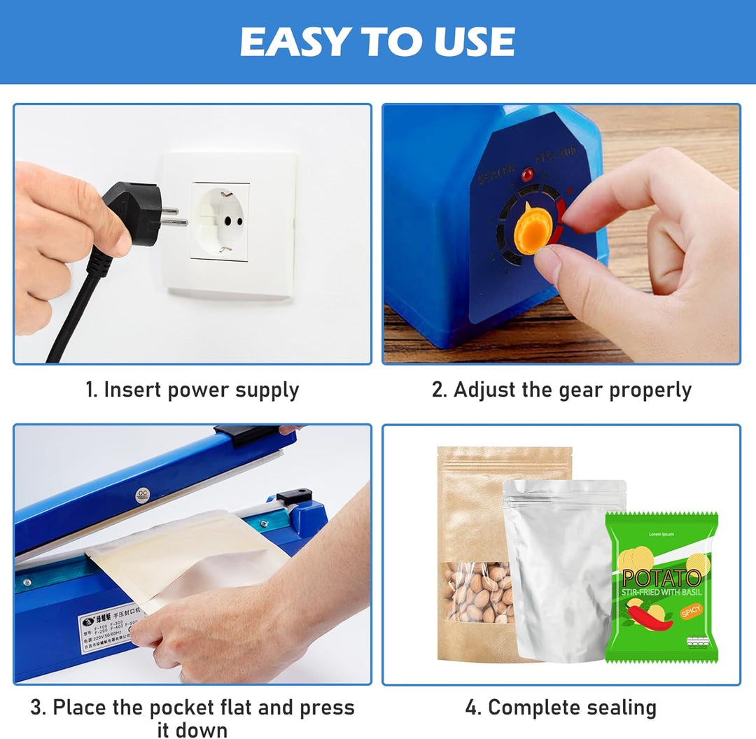 - 【Das Folienschweissgerät ist leicht zu bedienen】Einfach Beutel einlegen, wählen Sie die gewünschte Temperaturstufe und drücken Sie den Griff, um Stromversorgung zu aktivieren. Versiegelung dauert 1-3 Sekunden; Stromversorgung schaltet sich