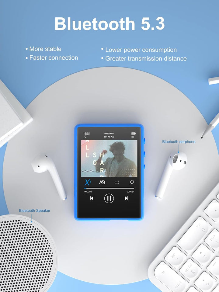 • ♫ Wireless 5.0 Bluetooth:Die Bluetooth-Verbindung zu den Kopfhörern ist stabil, man kann stundenlang ohne Verbindungsprobleme Lieder über sie abspielen.【WICHTIG】Dieser MP3 Player ist eine Bluetooth Transmitter, nicht ein Empfänger, kann es nicht Paar mit Handys.