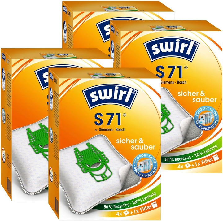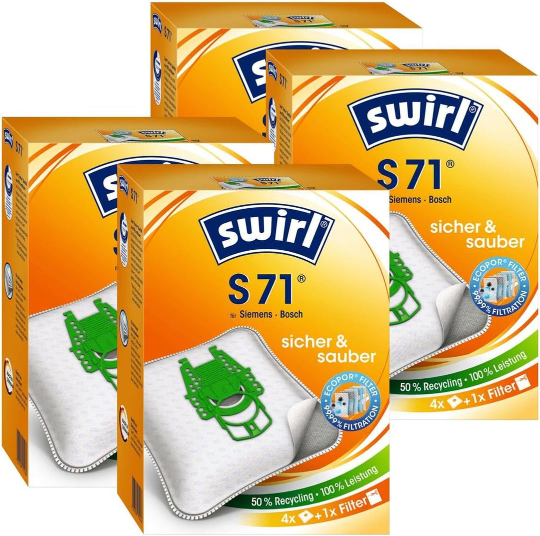 PRODUKTBESCHREIBUNGEN Swirl AirSpace Typ S71 Swirl Staubfilterbeutel MicroPor PLUS AirSpace ·MicroPor PLUS Filtration mit Anti-Allergen Filterschicht für ein sauberes, staubfreies und allergikerfreundliches Reinigungsergeb-nis ·Höchste Saugkraft bis zum vollen Beutel dank AirSpace Long Power-Garantie ·DIRTLOCK Funktion für eine staubfreie Entsorgung des vollen Staubfilterbeutels Lieferumfang: 4 Packungen Swirl S71 (4 Beutel + 1x Filter) = 16x Hochwertige Staubsaugerbeutel + 4 Filter passend für: BOSCH / SIEMENS Dynapower P - Swirl MicroPor S71 BOSCH * BSG 71800 * BSG 72000 * BSG 71825 * BSG 71866 * BSG 82000 * BSG 82000 - BSG 82090 * BBZ 52AFP * ERGOMAXX * FORMULA 1800 * FORMULA 2000 * FORMULA PROANIMAUX * FORMULA PROSLIENCE * PARQUET * PROHYGIENIC SIEMENS * Dynapower Serie * VS08 G 2010 - VS08G 2090 * VS08 G 1800 - VS08G 1870 * VZ55AFP