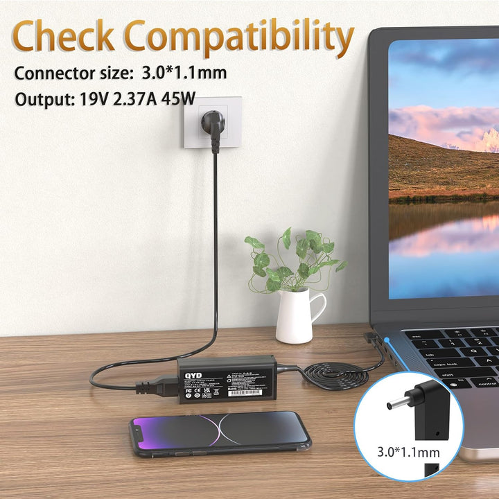 - 【Schnelle Ladung, Schlankes, Leichtes Design】Eingang: 100-240V 1,5 (50-60 Hz) / QYD 45W Netzteil Ausgang: 19V 2.37A 45W. Steckergrösse: 3.0*1.1mm.QYD 19V 45W Laptop Ladekabel für Acer Aspire 3 A314-22, A314-23P, A314-35, A315-35, A315-23, A315-24P,