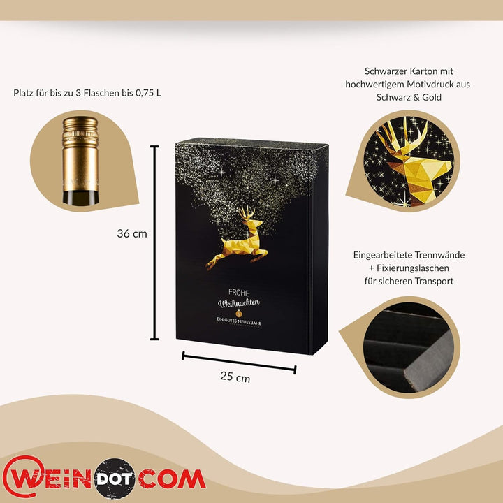 - 5 hochwertige Weingeschenkkartons, Masse: 360 x 250 x 90mm. Passend für je drei Flaschen (max. 1,0 L). Lieferung ohne Deko/Weinflaschen.