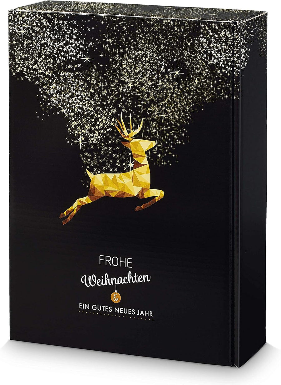 - Wein Flaschenverpackung aus stabilem Karton. Aussen wie innen schwarz, Motiv in Gold und Weiss.
