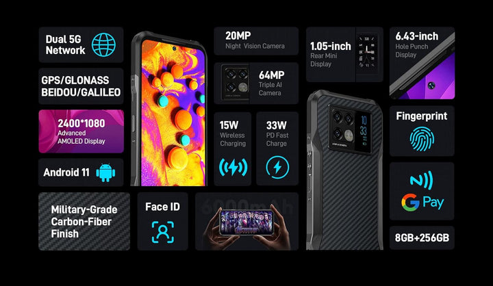 - ★【1,05" Rückseitiges Mini-Display, branchenführendes Design auf einem robusten Telefon:】V20 ist mit einem 1,05-Zoll rückseitigen Mini-Display ausgestattet. Es eignet sich hervorragend zum Überprüfen der Uhrzeit, zum Abrufen von Benachrichtigungen, zur Musiksteuerung und vielem mehr. Es ist auch praktisch in Situationen mit niedrigem Stromverbrauch. Überprüfen Sie Ihre Benachrichtigungen, ohne das gesamte Display zu beleuchten. Das Display kann auch an dem persönlichen Stil angepasst werden.