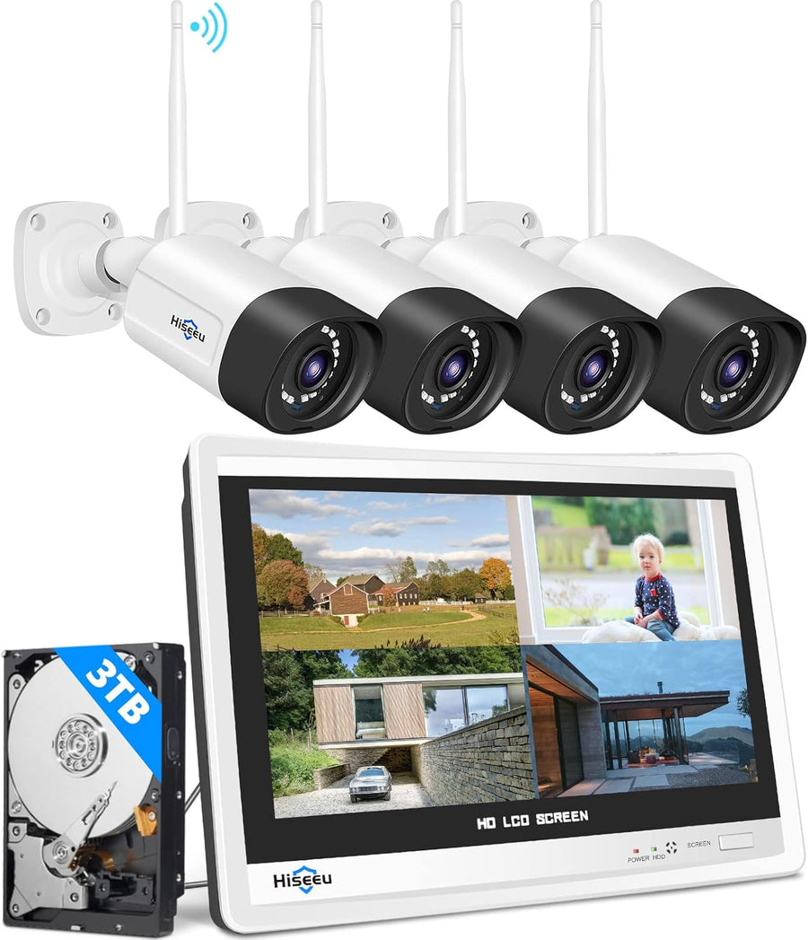 - 【12 Zoll Monitor, 5MP Ultra HD Auflösung】Die 10 Kanal Funk Überwachung set von Hiseeu mit 3TB Festplatte eingebautem 12" LCD Monitor und Automatische Paar Kameras. Das 5MP HD kabellose Sicherheitskameras sind klarer als 1080P-Kameras. Egal zu