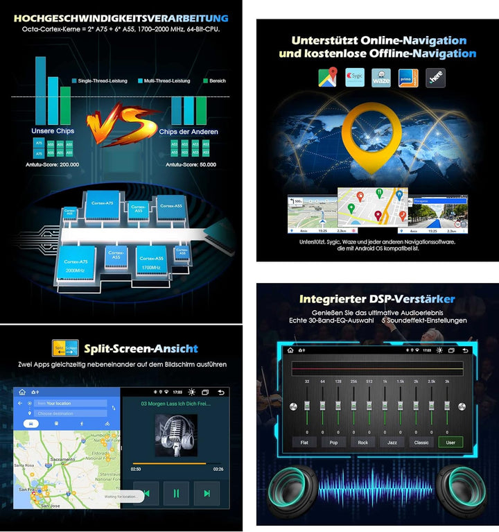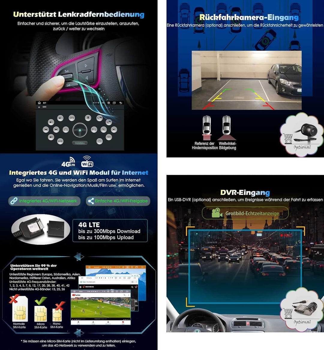 - 【Navigation & 4G & WiFi】✔ Sat Nav/GPS-Navigation vorinstallierte lokale Offline-Karten. Online-Karten werden auch nach einer Internetverbindung unterstützt, Sie können Karten-/Navigations-Apps (iGO, Waze, Sygic, HereWeGo) entsprechend der täglichen Nutzung installieren. ✔ Eingebautes Dualband-WLAN-Modul, 4G-Modul, Zugriff auf das Internet über Hotspot-Verbindung oder Einlegen einer Micro-SIM-Karte, einfacher und schneller für Online-Navigation, Musik, Filme usw. Mehr Auswahl während der Fahrt.