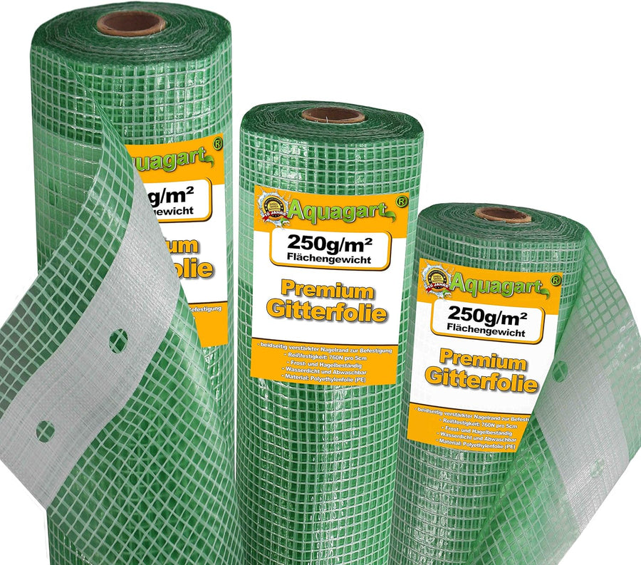 - Die Gitterfolie besteht aus einem starkem HDPE Basisgewebe mit optimaler UV-Stabilisierung, so dass eine lange Lebensdauer gewährleistet wird. Die Folie verfügt, zur einfachen Befestigung, über einen verstärkten Nagelrand.