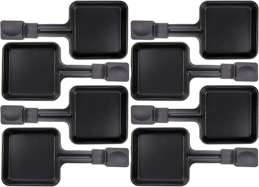 8x Raclette Pfännchen 23178 10x10cm, Griff Extra Lang, Universell für Raclettes (Masse siehe Text)