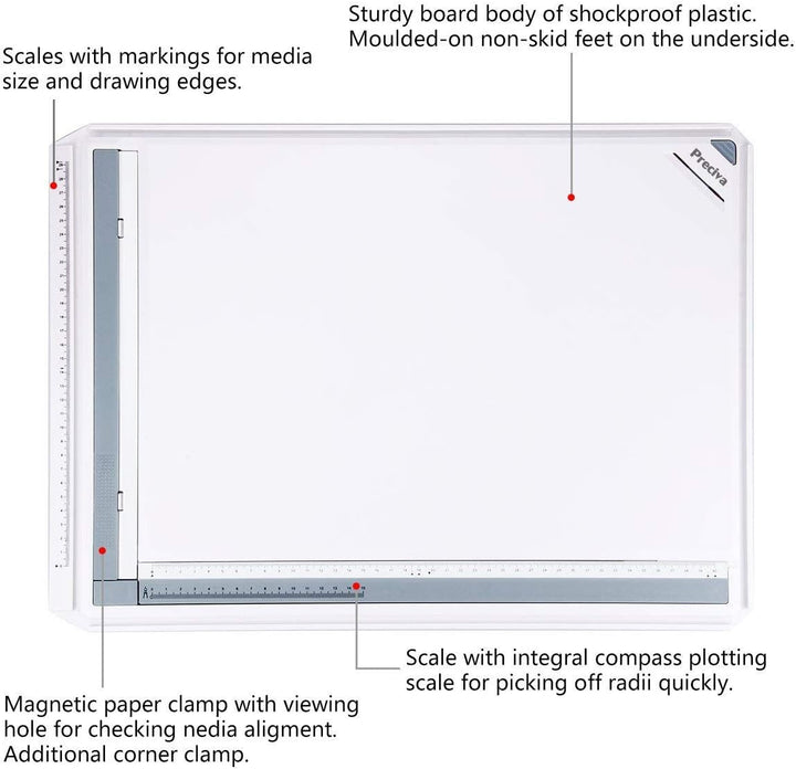 - Preciva A3 Zeichenbrett mit Zubehör hat man viele Möglichkeiten Zeichnungen mit verschiedenen Winkeln herzustellen ohne das etwas verrutscht.