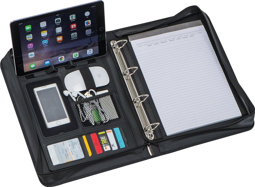 - DIN A4 Aktenmappe mit Schreibblock, Handyfach oder Smartphonefach, Ringbuchbindung und Tablethalterung