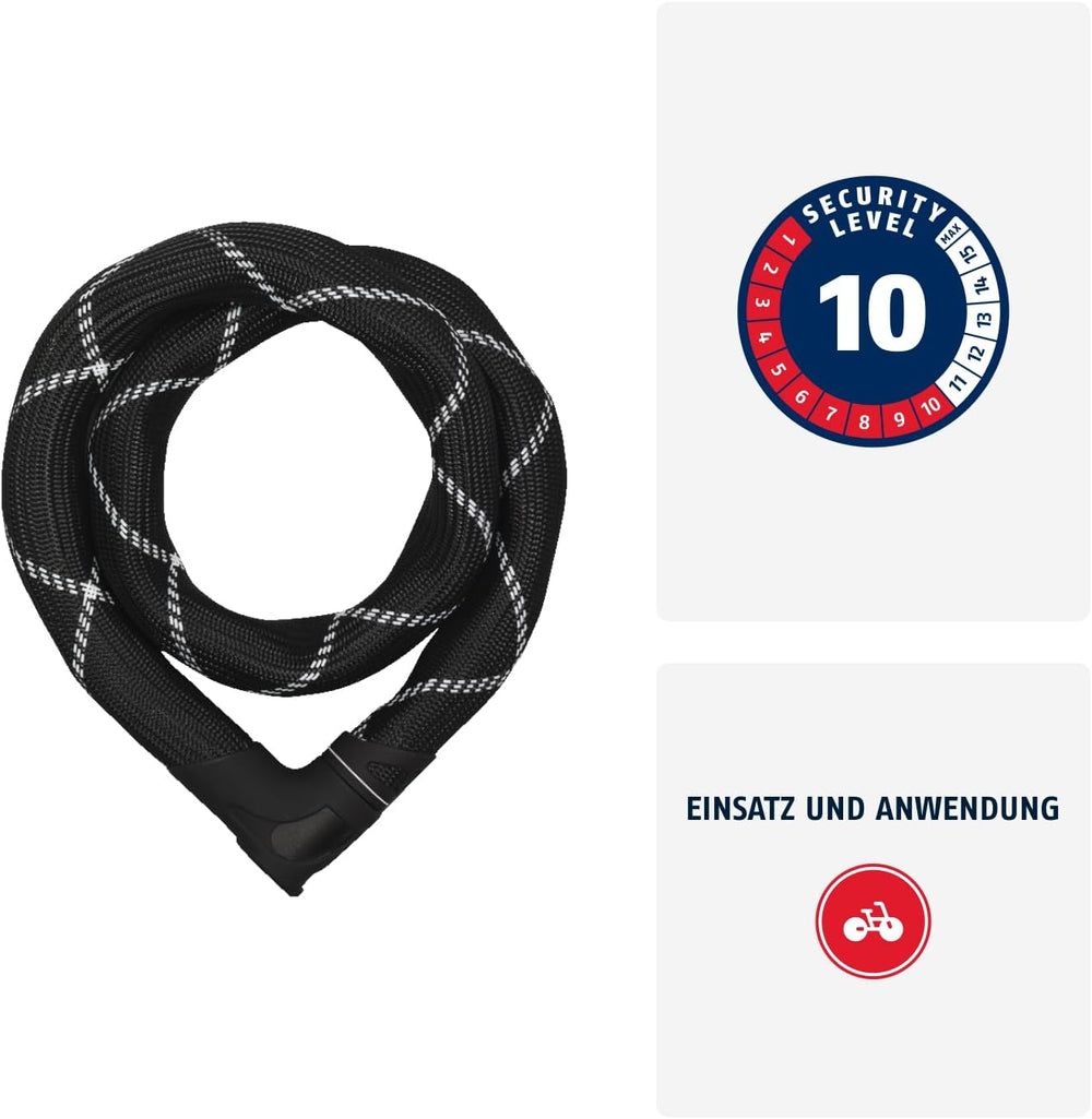 - Robustes Fahrradschloss mit ABUS-Sicherheitslevel 10: Das hochwertige Kettenschloss mit 8 mm dicker Vierkantkette und innovativer, hochflexibler Kunstfaserummantelung sichert Ihr Rad zuverlässig