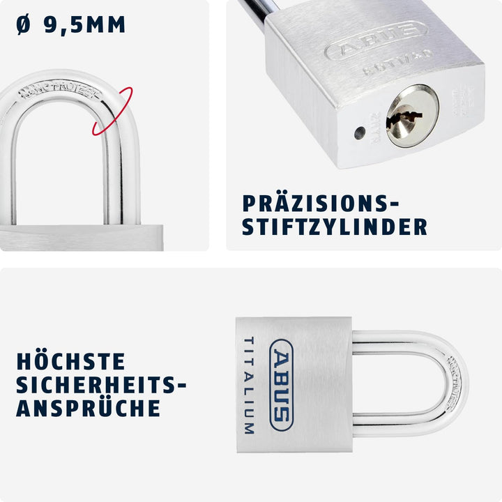 - Starkes Schloss für Objektsicherheit: ABUS-Sicherheitslevel 8 - Gewicht 212 g - Breite 50 mm, Höhe 92 mm, Tiefe 23 mm, Bügeldurchmesser 9,5 mm, lichte Bügelhöhe 34 mm, lichte Bügelweite 25 mm