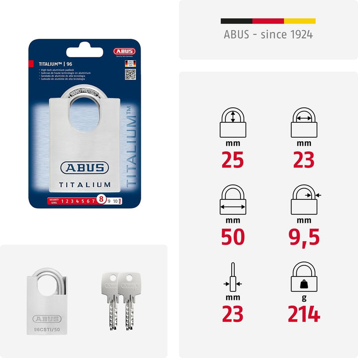 - Starkes Schloss für Objektsicherheit: ABUS-Sicherheitslevel 8 - Gewicht 214 g - Breite 50 mm, Höhe 82 mm, Tiefe 23 mm, Bügeldurchmesser 9,5 mm, lichte Bügelhöhe 25 mm, lichte Bügelweite 23 mm