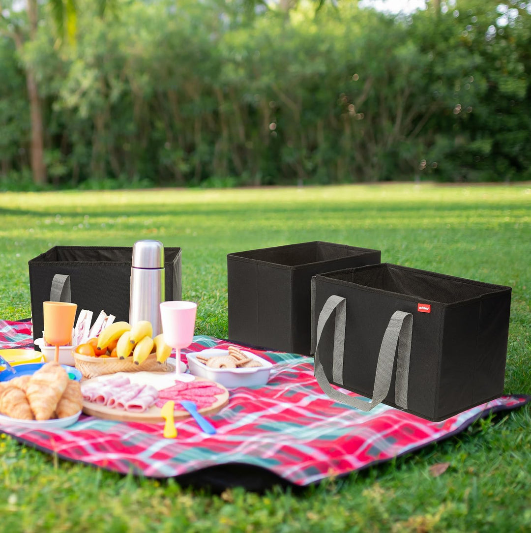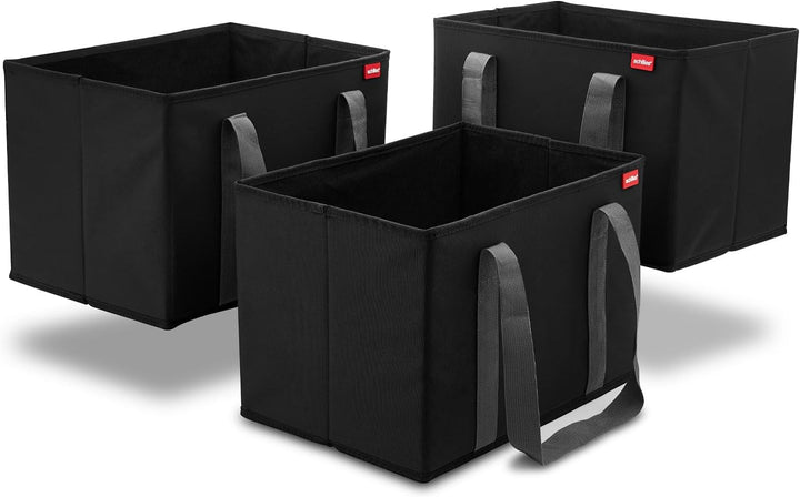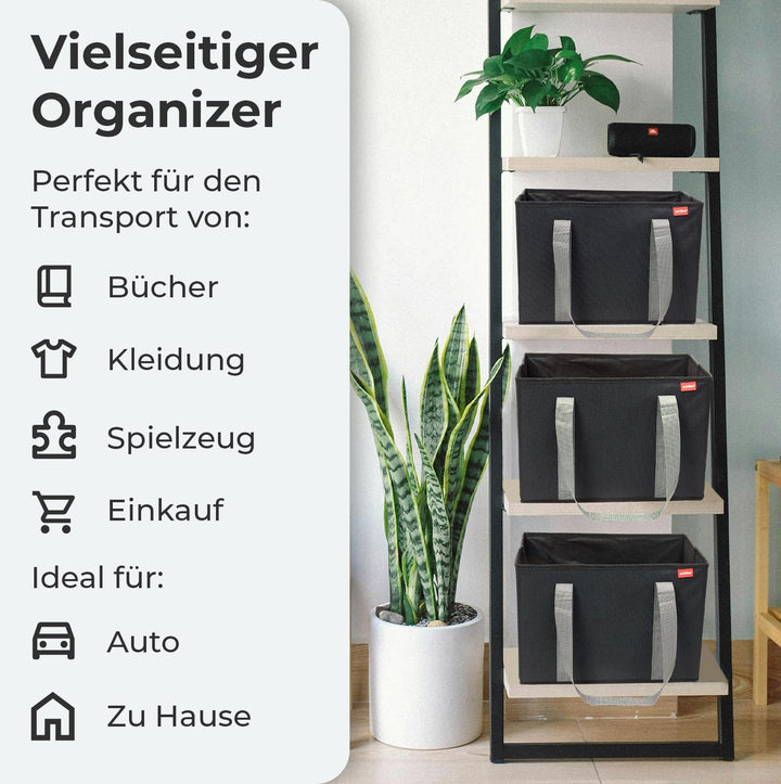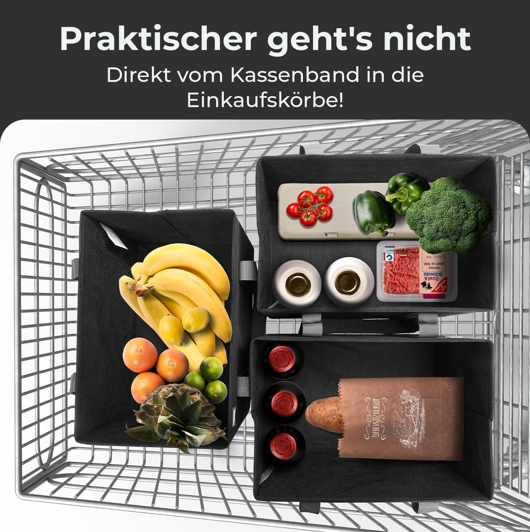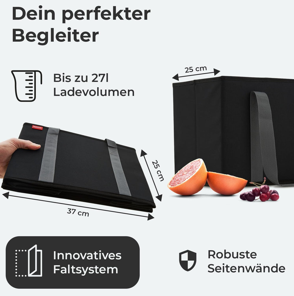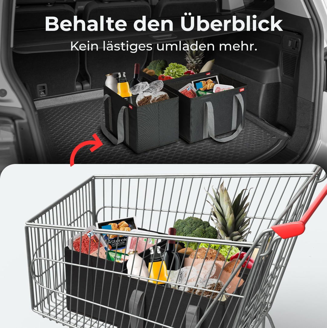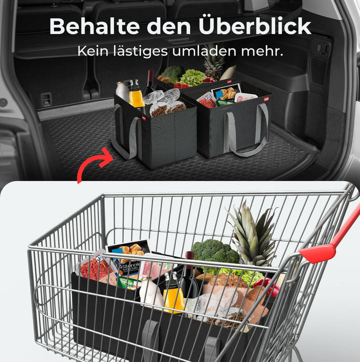 - FALTBAR & KOMPAKT: Die faltbaren Einkaufskörbe bieten ein grosses Stauvolumen von 3x ca. 25 Litern (37 x 25 x 25 cm). Alle drei Boxen lassen sich dennoch platzsparend zusammenfalten, wenn sie mal nicht benötigt werden. Dadurch wird sie zum faltbaren, extrem kompakten Organizer im Auto oder beim Einkaufen!