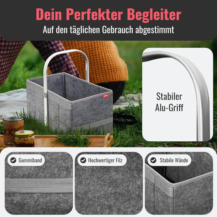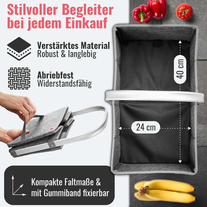 - STILVOLLER BEGLEITER: Die hochwertige Verarbeitung bei diesem Einkaufskorb aus reissfestem Filz und Aluminium, macht diesen Tragekorb zu einem stilvollen Begleiter bei jedem Einkauf oder beim Picknick im Park. Er ist leicht und faltbar!