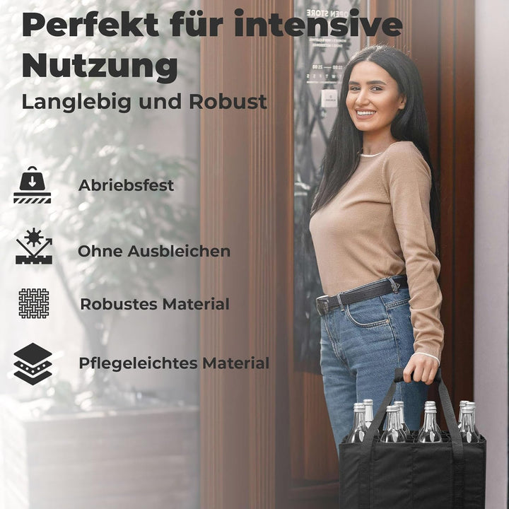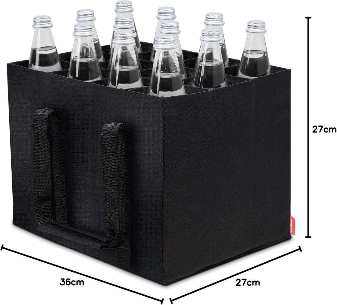 - SICHER & KOMPAKT: Mit der praktischen Flaschentasche lassen sich volle Flaschen, aber auch Leergut, sicher und geordnet transportieren. Die einzelnen Trennwände sorgen für Ordnung in Fahrzeugen, Schränken, Küchenoberflächen usw.