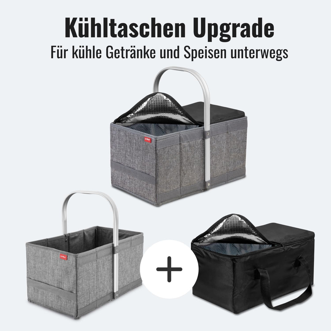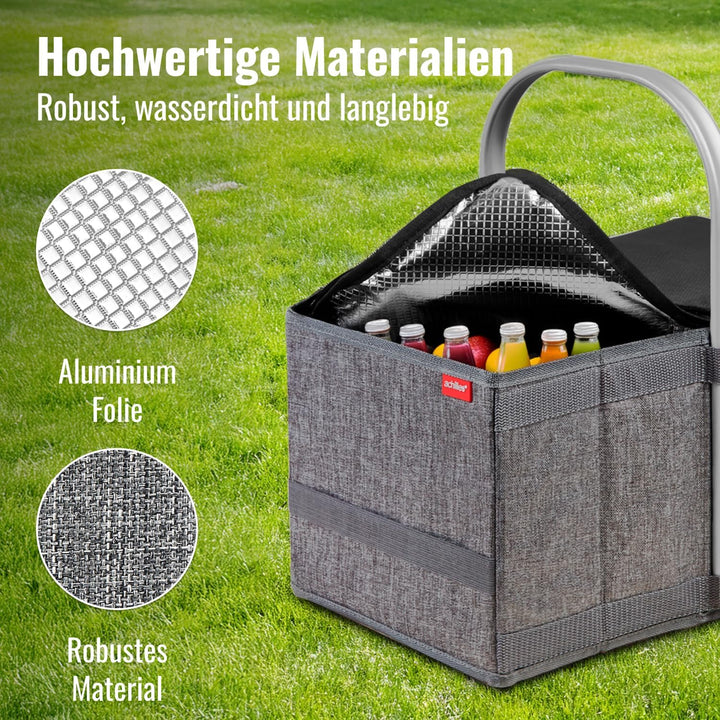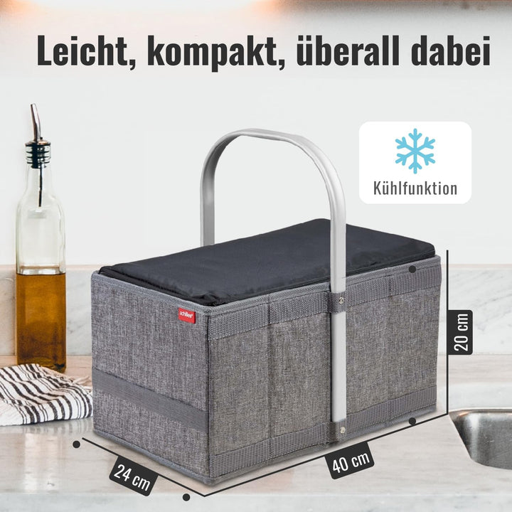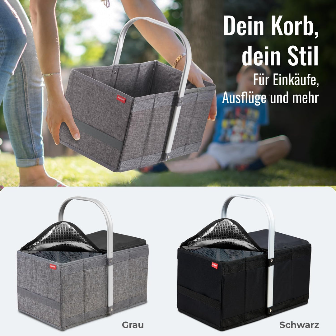 - Die Verarbeitung aus reissfestem Polyester, dem Aluminium-Griff und der dem Kühleinsatz macht den Einkaufskorb zu einem stilvollen Begleiter bei jedem Einkauf oder Picknick im Grünen.