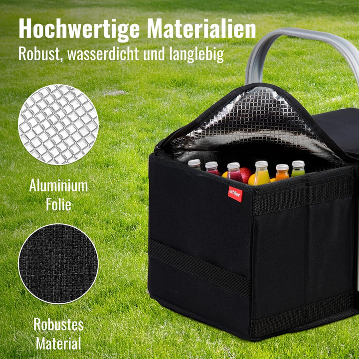 - Der wasserabweisende Stoff, ist einfach zu säubern und hat ein sehr geringes Eigengewicht. Der verstärkte Boden sichert einen sicheren Stand. Das Innenfutter besteht aus isolierter Aluminium-Folie und ist mit Schaumstoff gepolstert, um eine gute Isolationswirkung zu gewährleisten und Lebensmittel frisch warm oder kühl zu halten. Deshalb kann die Temperatur im Inneren möglichst lange halten und den Inhalt vor der Aussentemperatur zu schützen.