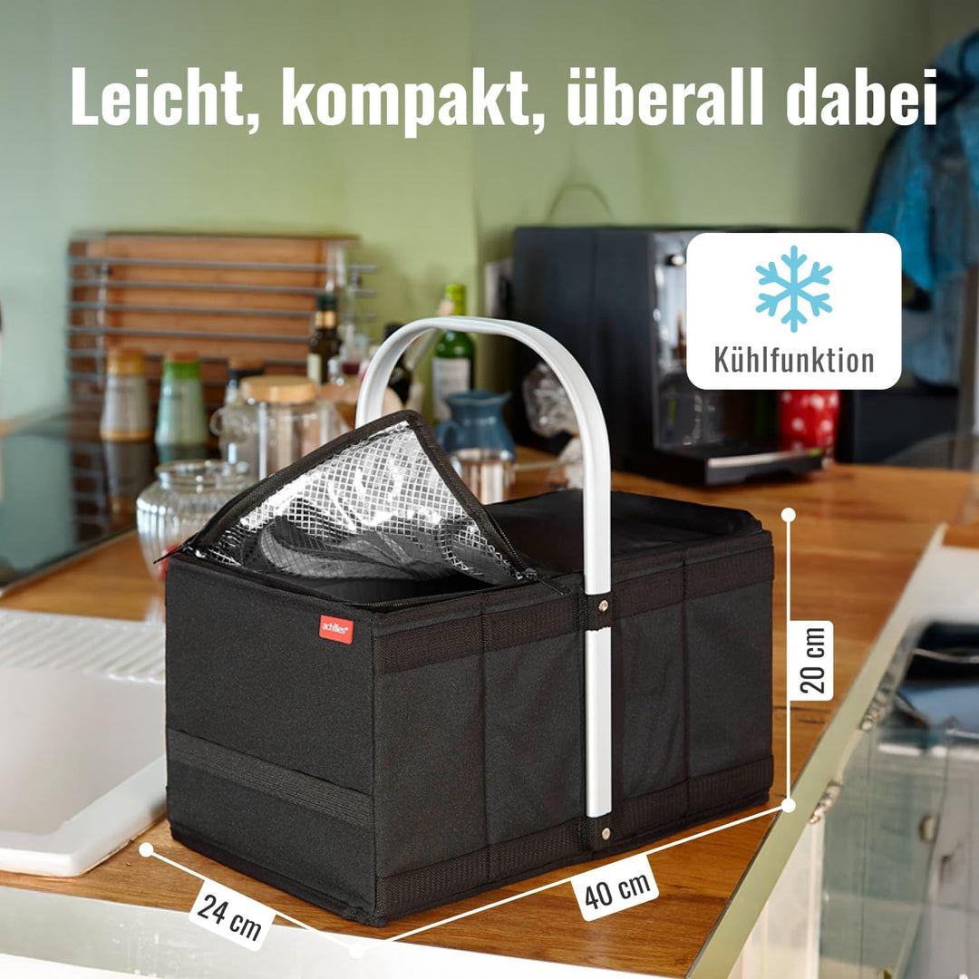 - Die ungefaltete Abmessung vom 1000 g leichten Einkaufskorb betragen L40xB24xH20cm (Bügelhöhe 40 cm).